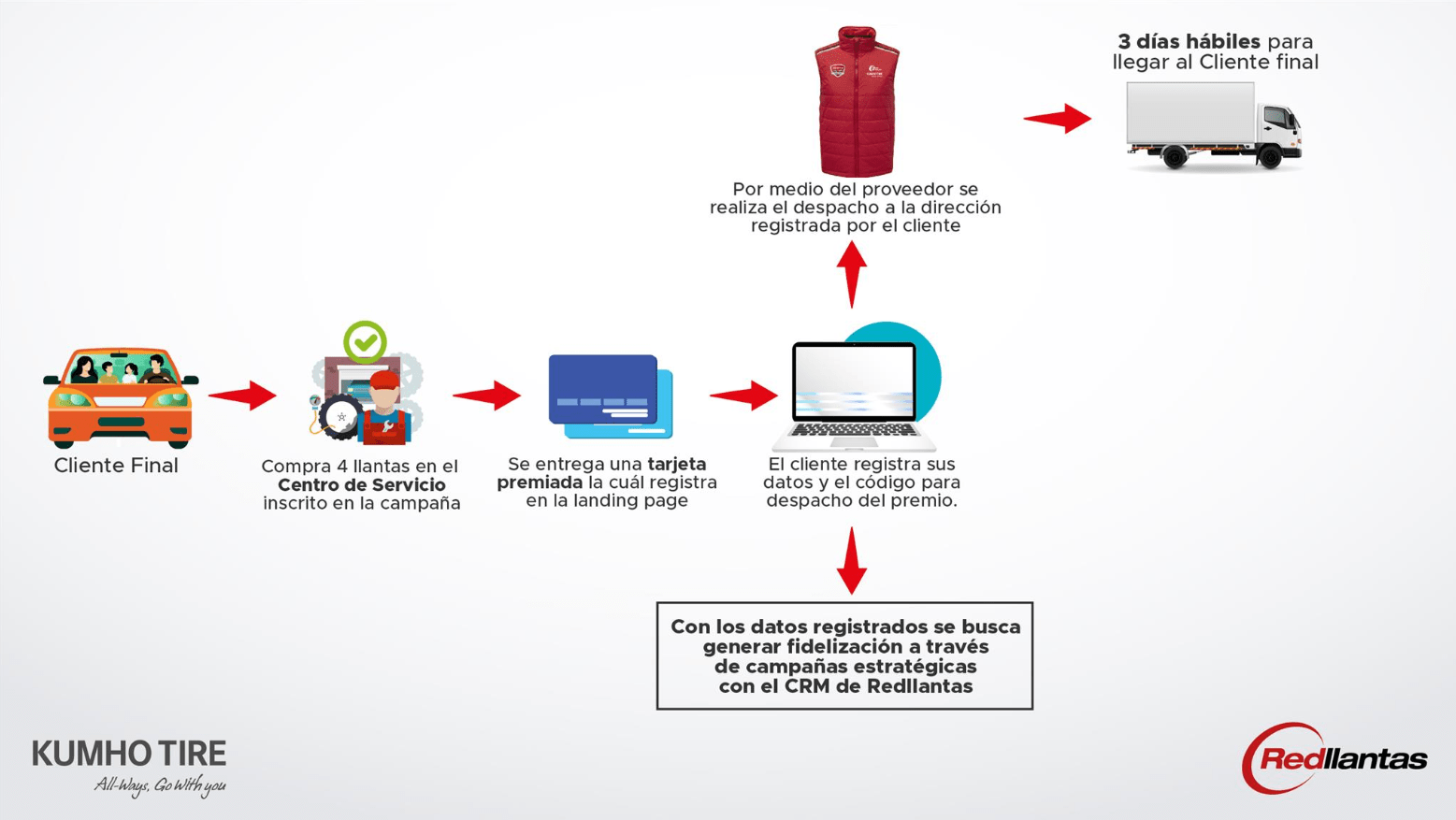 Por la compra de cuatro (4) llantas del nuevo labrado MT71 en la marca Kumho, se despachará junto con las llantas una tarjeta para el cliente final el cual con este código podrá recibir el chaleco a vuelta de correo certificado una vez digite sus datos en la plataforma web.